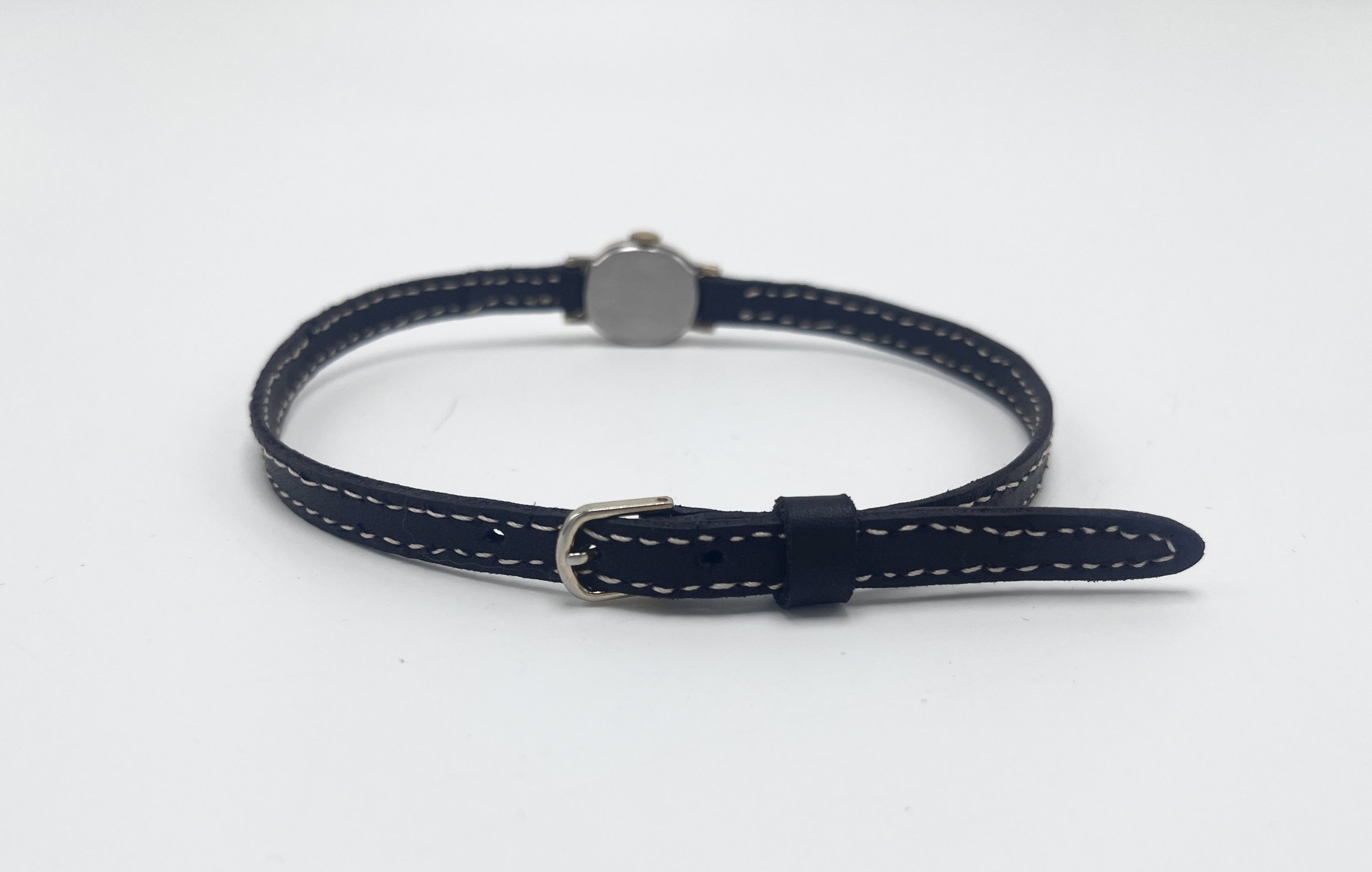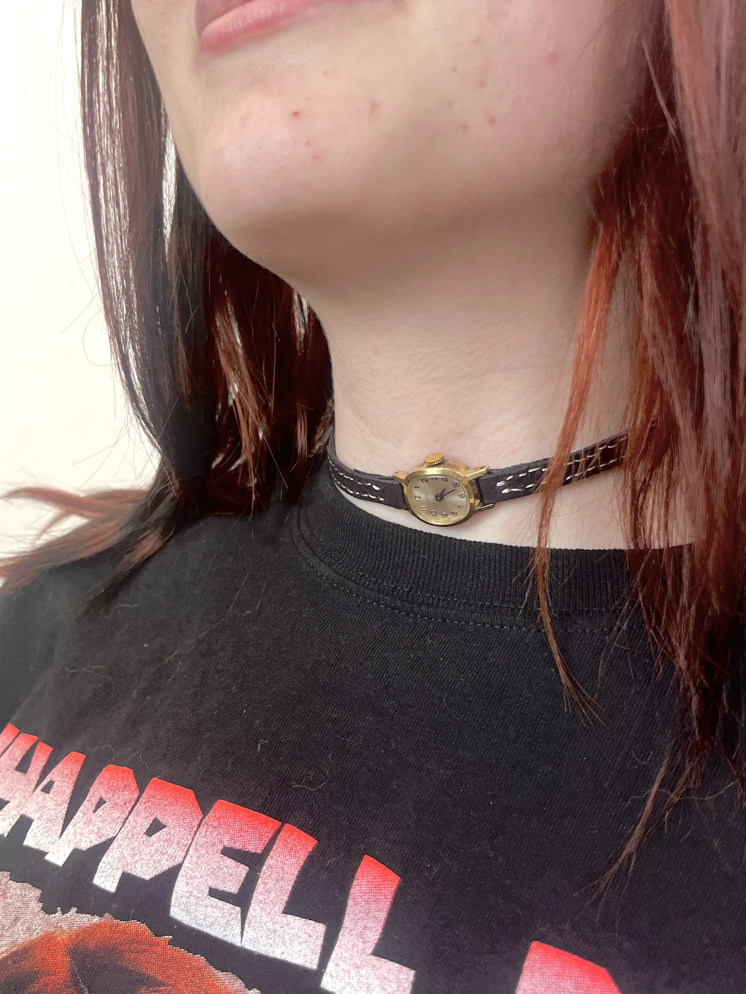 This was my very first project I ever made with leather. I had thrifted the hardware from a local antique shop. The clock face didn’t work so I figured it would be perfect to be a part of this idea that I had after I saw my roommate turn one of her watches into a necklace. The leather is a true 1oz pig skin lining. I laminated two sides together and fished it through my hardware. The final design is a dainty and subtle piece of jewelry and can be worn up or down depending on the situation.
