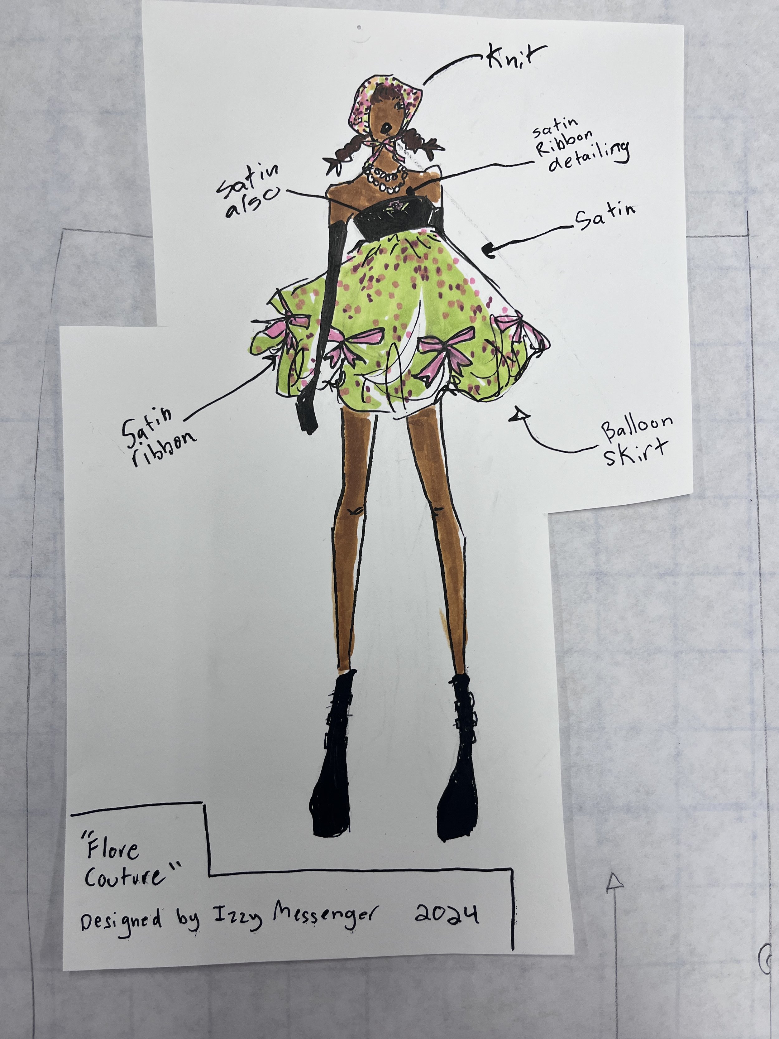 A polyester satin bubble dress. It was inspired by flora and the idea of wildflowers in a meadow. This was my first time making a garment for someone who is not myself. I patterned it through a mix of draping and flat patterning. The bonnet was hand knitted by me also.